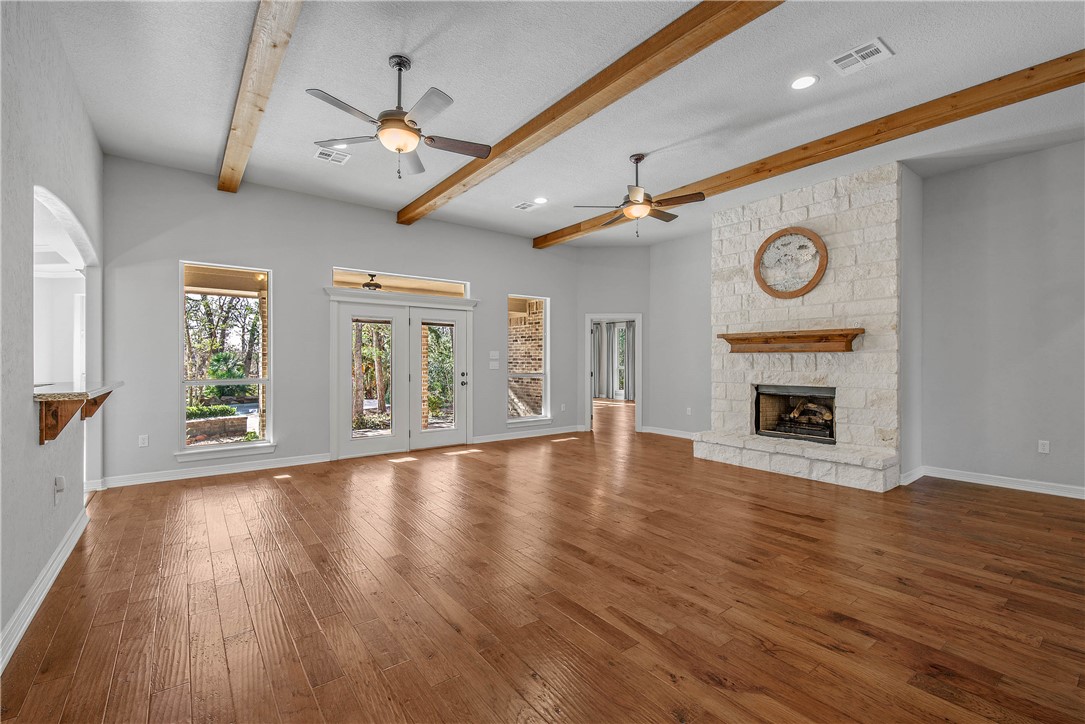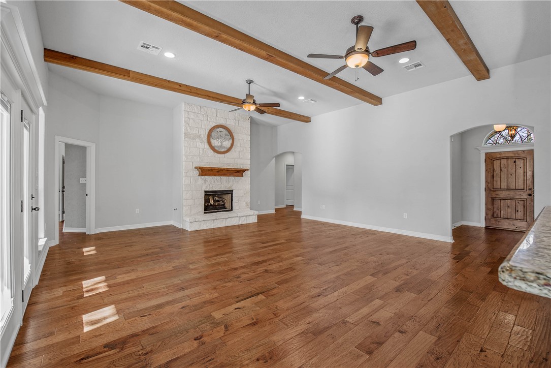 Escape to Paradise EVERYDAY!! Experience this extraordinary custom built, single level 3,038 sqft home, tucked away in the highly coveted neighborhood of Duck Haven Estates! Be prepared to fall in love as you drive up to this secluded retreat, perfectly situated on a picturesque 1.15-acre cul-de-sac lot. This beautiful home offers 4 generously sized bedrooms, 2.5 bathrooms, and a spacious 2-car garage, all designed to provide both comfort and elegance. The 2021 built pool and spa create a backyard paradise, featuring three cascading waterfalls and surrounded by meticulously landscaped gardens maintained with a drip irrigation system. Inside, the inviting living room showcases rustic wood beams and a striking floor-to-ceiling Austin stone fireplace, adding warmth and character to the heart of the home. The gourmet kitchen is a chef’s delight, boasting granite countertops, a central island, eat-at bar, stainless steel gas cooktop, double ovens, and a walk-in pantry. The formal dining room and sunroom overlook the stunning pool, providing a serene setting for dining and relaxation. Duck Haven Estates community is nestled among majestic heritage oaks with walking trails, a fishing pond, park and abundant wildlife- a paradise and retreat for nature lovers who also want easy access to everything the city has to offe. Experience the perfect blend of luxury, privacy, and natural beauty — this dream home is ready to welcome you! ***New Carrier 15.2 SEER HVAC system installed***