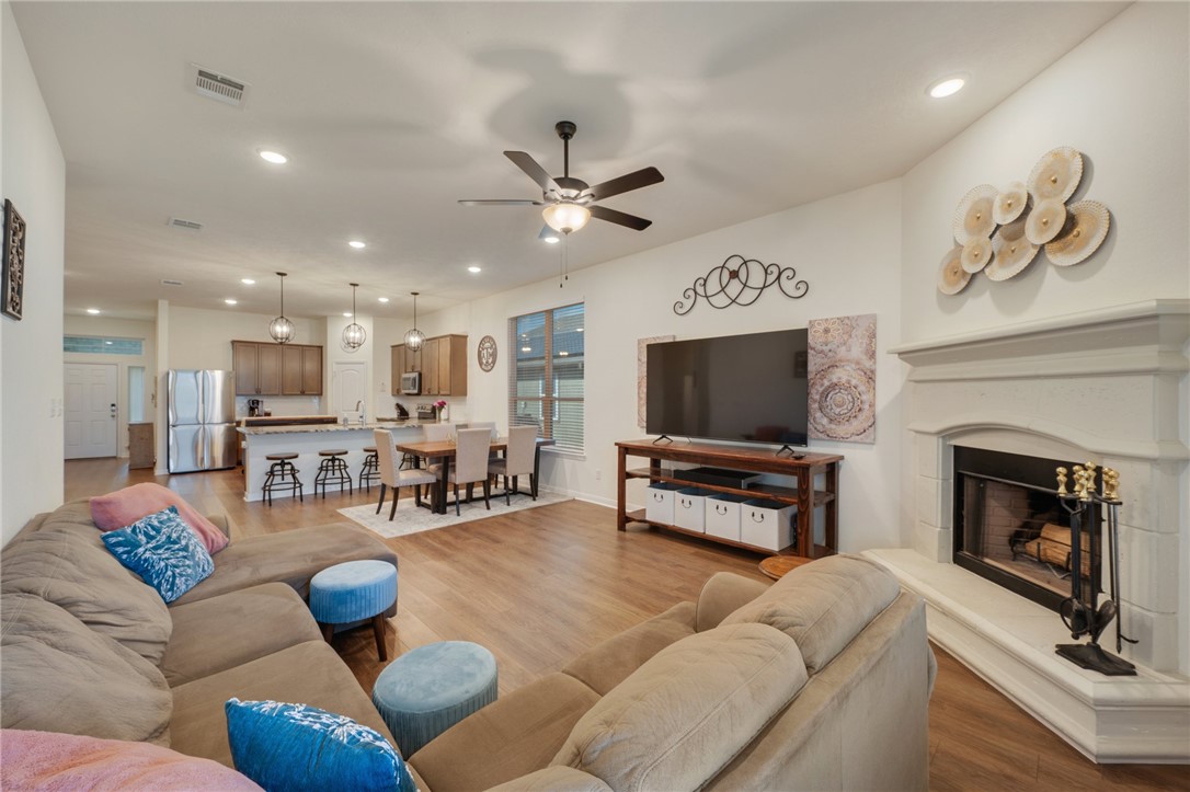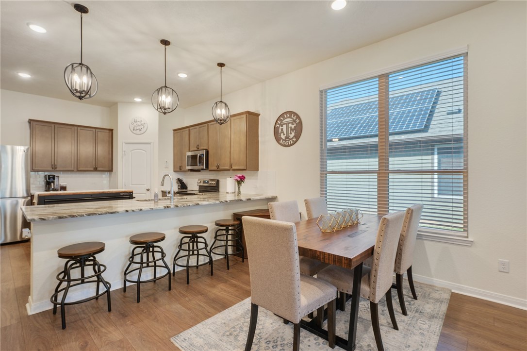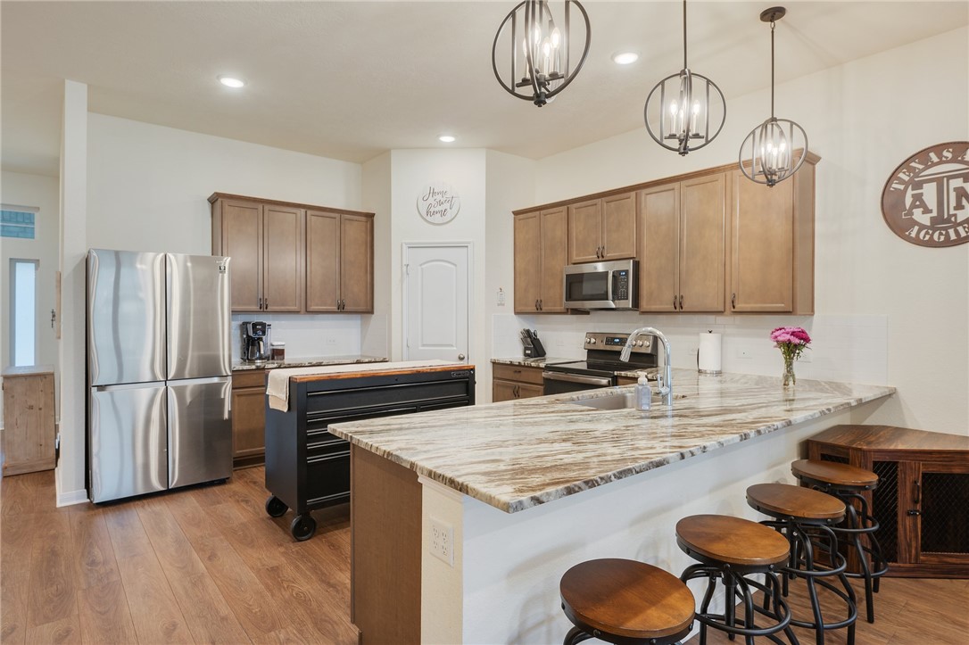 Standing proudly in the tranquil Pleasant Hill neighborhood, this beautiful single-story Bryan home built in 2021 is a must-see! Bursting with captivating curb appeal, this gorgeous haven transitions to a modern interior that blends neutral tones with sleek wide-plank flooring and additional can lighting. High ceilings and large windows lend a bright atmosphere to the open-concept living areas where a cast stone wood burning fireplace radiates warmth on cooler evenings. Your entertainer’s kitchen flaunts its handsome cabinetry, generous pantry, gleaming countertops alongside the multi-seat peninsula.