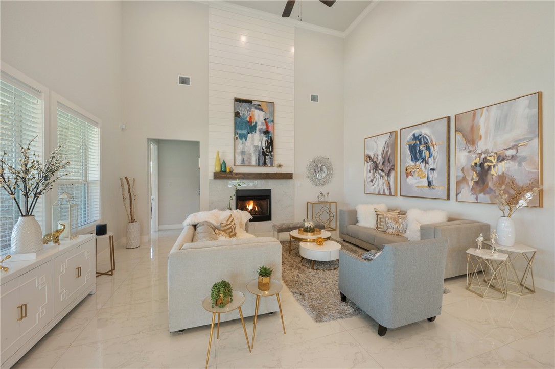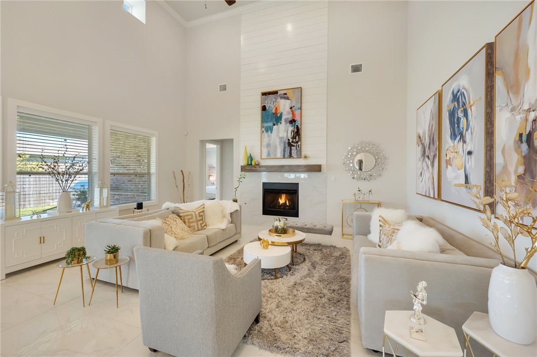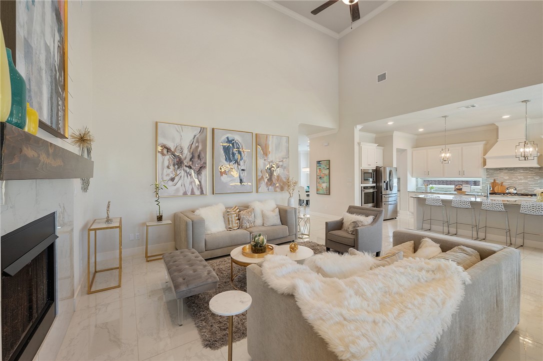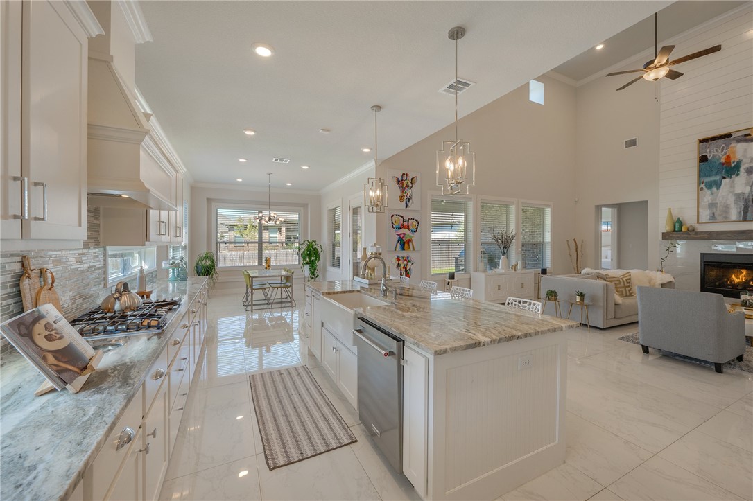 This beautiful home in Castlegate II will take your breath away!!! It has 4 bedrooms, 4.5 bathrooms, a study and game room! With soaring ceilings, lovely staircase and elegant flooring and finishes this home is designed with an open layout. Light and bright with huge windows. The kitchen is a cooks dream and the heart of the home with a butler's pantry off the walk in pantry. A magnificent fireplace with gas logs in the living room is a great place to warm up and get cozy. The primary suite is spa like with space for a sitting area and with a divine bathroom that leads to the laundry room. A secondary bedroom with on suite bathroom that has a walk in shower is also located on the first floor. Upstairs is a game room and 2 more secondary bedrooms and 2 baths. Enjoy the outside covered patio and kitchen with built in grill and sink. This home has a ton of energy efficient features like spray foam insulation and tankless water heater. Close to schools and shopping. Call today to schedule your private showing.