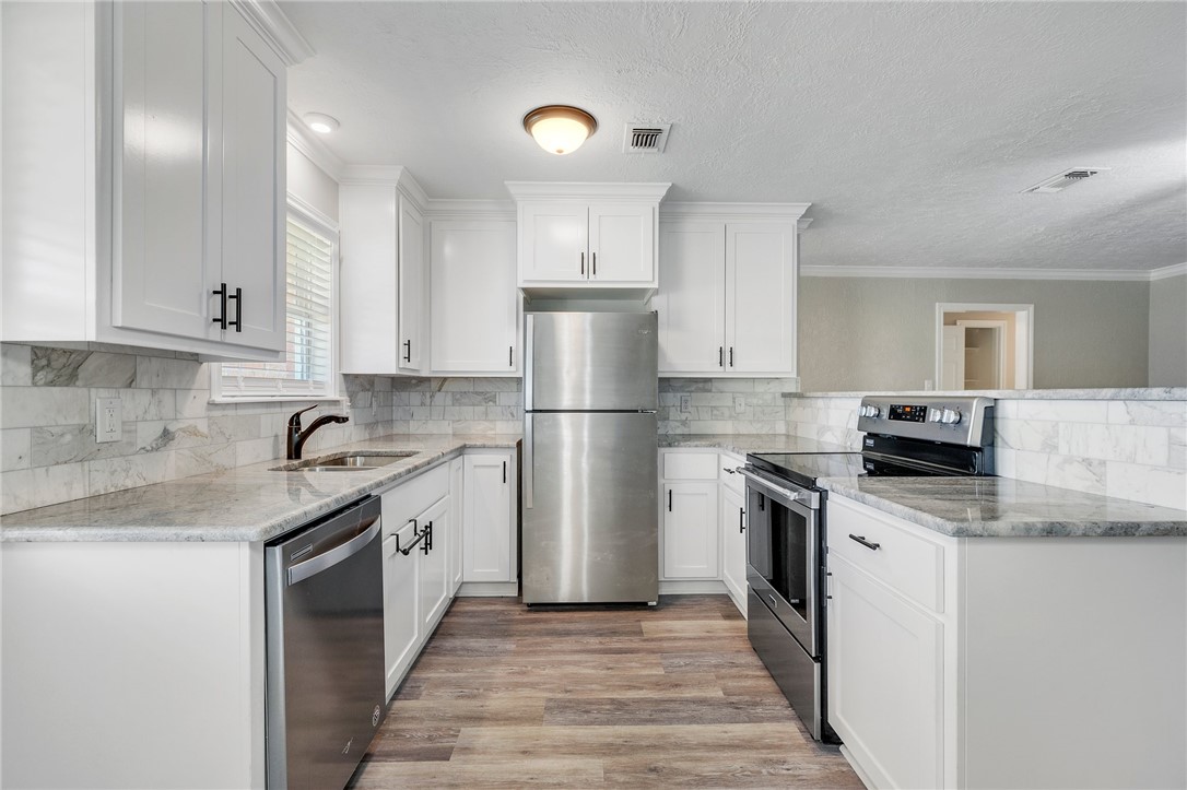 This beautifully updated home, located directly across from the highly regarded Johnson Elementary School, is ready for you to move in and enjoy! Freshly painted in modern grey tones and boasting new flooring throughout, this home offers a bright and airy atmosphere perfect for both relaxing and entertaining. The fully remodeled kitchen features sleek stainless steel appliances, new cabinetry, stylish fixtures, elegant granite countertops, and a complementary backsplash, creating a functional and inviting space. The spacious master suite includes a charming barn door that opens to a luxurious en-suite bath, complete with new vanity and a stunning glass walk-in shower. The guest bathroom has also been upgraded with a new vanity and updated tile tub/shower. With all-new interior and exterior doors, energy-efficient windows throughout, and a new roof, this home combines style and practicality. Don't miss out—call today for your private tour!