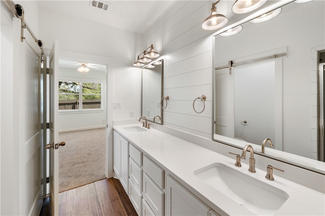 Stunning New Construction! This home features an open floor plan and a bright, modern farmhouse-style kitchen. Elevated ceilings with exposed beams enhance the living space, while subway tile showers and barn doors add charm to the bathrooms. Shiplap accent walls, neutral carpeting, and vinyl plank flooring create a perfect canvas for personalization. The laundry room, conveniently located off the 2-car garage, includes a sink and plenty of storage. Outside, a covered patio and fenced yard provide the perfect space for outdoor gatherings. Residents also enjoy Oakmont's impressive amenities, including a fitness center, cafe, pools, splash pad, sports fields, and hiking/biking trails.