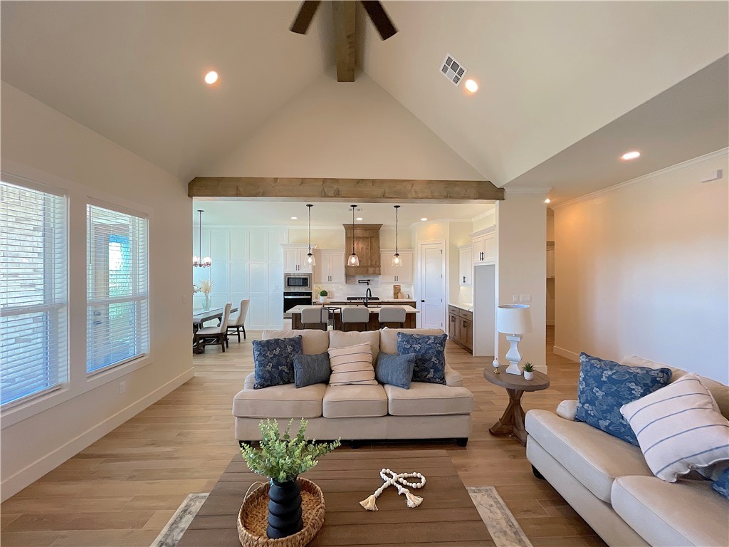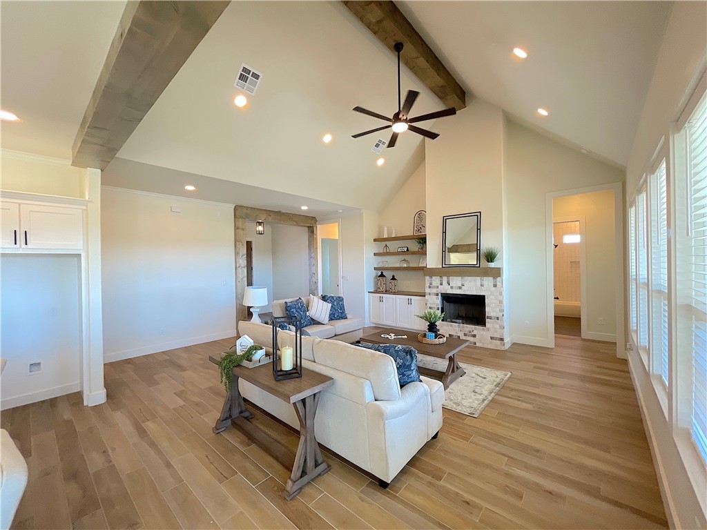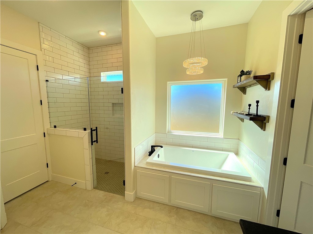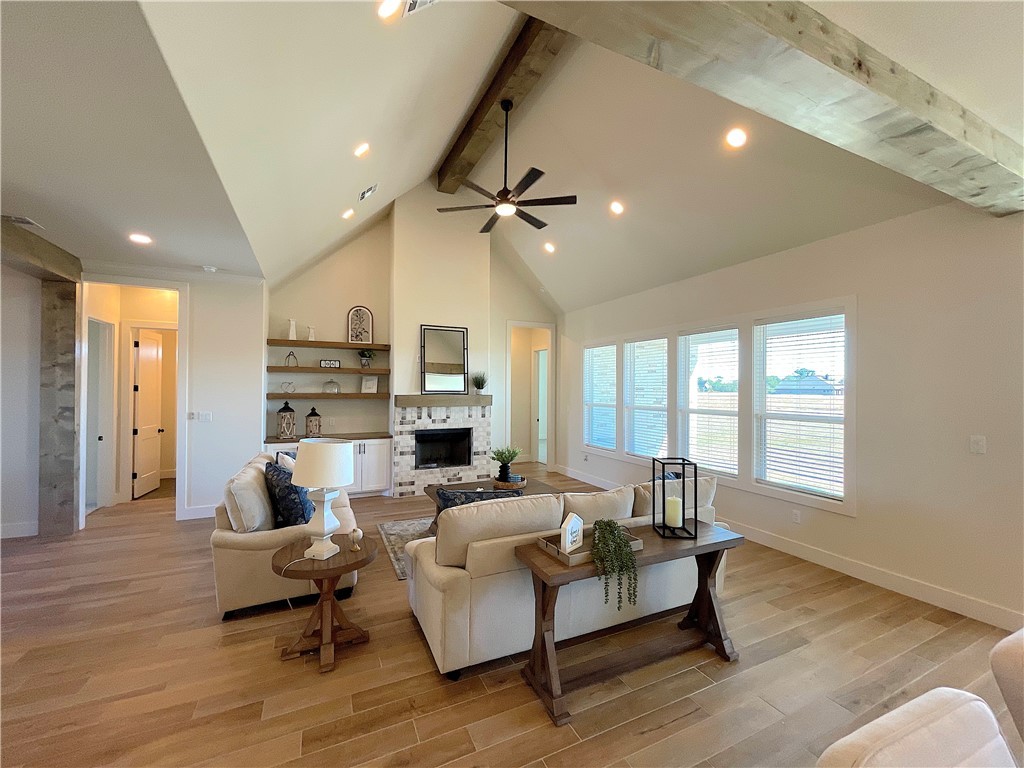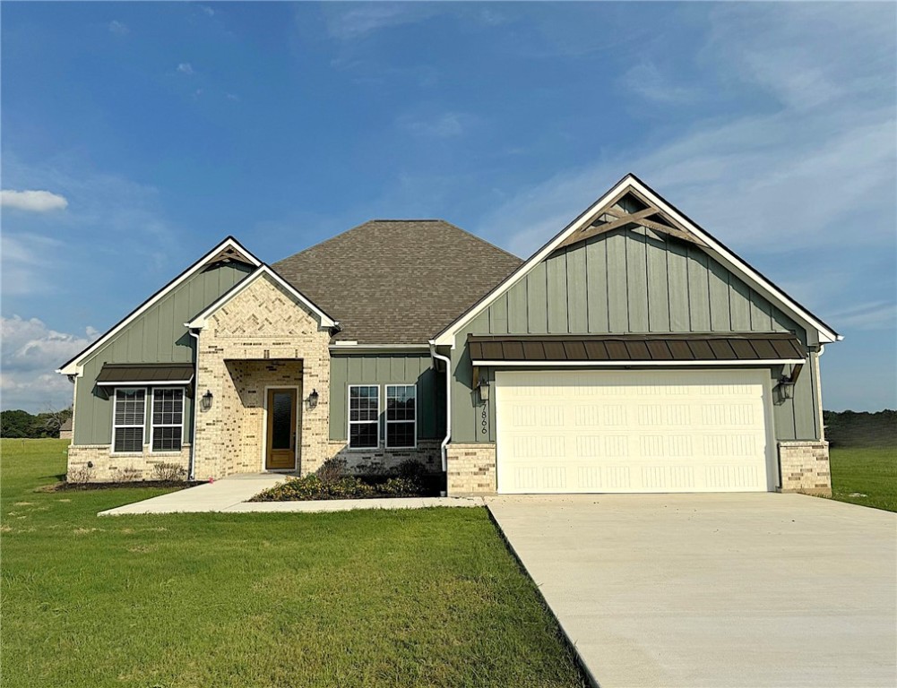 Welcome to Mathis Creek Drive! Located just outside city limits, enjoy quiet living on an acre of serene surroundings. As you step through the front door, you're greeted by an open floor plan that unites the living room, dining area, and spacious kitchen. The kitchen, showcases quartz countertops, tile backsplash, high-end stainless steel appliances, and an oversized island with an eating bar. The living area, showcases a brick fireplace and custom-built shelving making it the perfect spot for cozy evenings or entertaining guests. Complete with large windows allowing natural light throughout the common areas. The primary suite features a spa-like ensuite bathroom with a luxurious soaking tub, spacious walk-in shower, and elegant double vanity. Step outside to discover the covered patio, prewired for speakers and plumped for gas, this outdoor space is perfectly equipped for entertainment. Envision the possibilities, your forever home awaits!