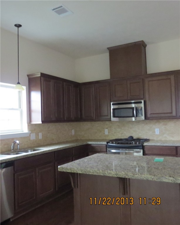 Four wonderful bedrooms that are super sized. If you love cooking, you will love this kitchen and the appliances. Comes with refrigerator, stainless steel gas range, stainless microwave, stainless dishwasher, large center island, pantry, lots of storage, huge utility room (connections only), large living area with corner fireplace with vinyl wood plank flooring throughout all living spaces. Corner lot with nice covered patio in backyard. Available for move in 7/25/25.
